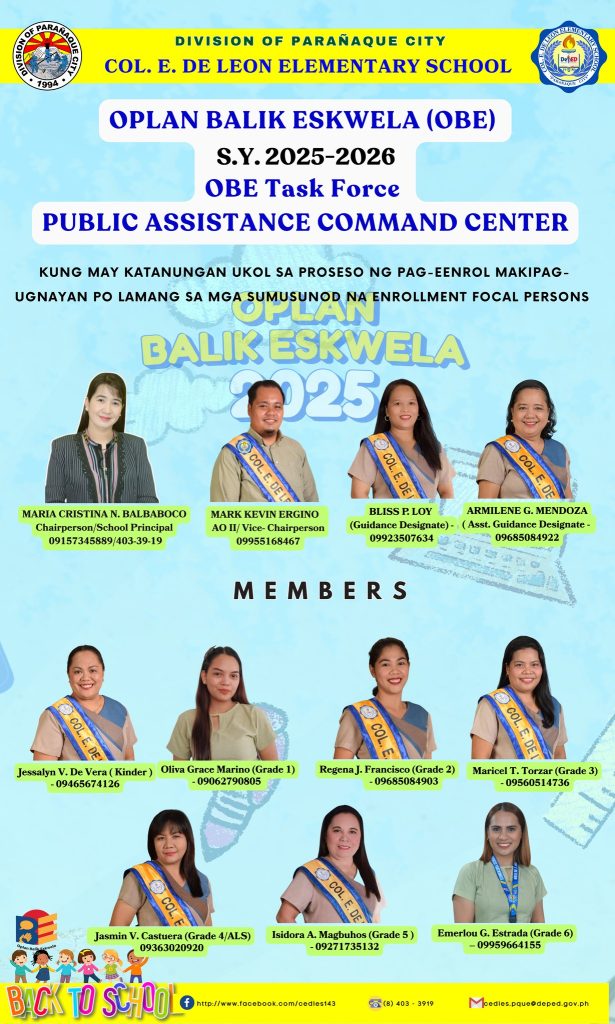 🔔 Para sa isang ligtas at maayos na pagbabalik-eskwela, hinihikayat po ang lahat ng magulang at tagapag-alaga na makipag-ugnayan sa ating OBE Team para sa anumang katanungan o karagdagang impormasyon.