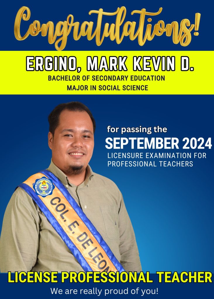 Congratulations to our Col. E. De Leon Elementary School Administrative Officer II, Mark Kevin D. Ergino, for passing the September 2024 Licensure Examination for Professional Teachers! We are really proud of you!