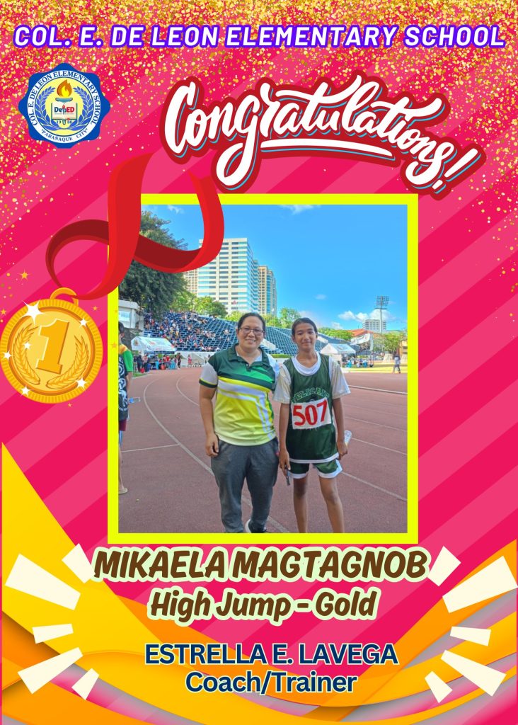 Congratulations to Mikaela Magtagnob on her outstanding performance in the high jump, securing a gold medal! Her hard work and dedication have earned her a spot in the Palarong Pambansa in Ilocos Norte, where she will proudly represent Col. E. De Leon Elementary School. With the guidance of her coach and trainer, Estrella E. Lavega, Mikaela is ready to take on the national stage and showcase her incredible talent. Best of luck in the next stage of the competition!